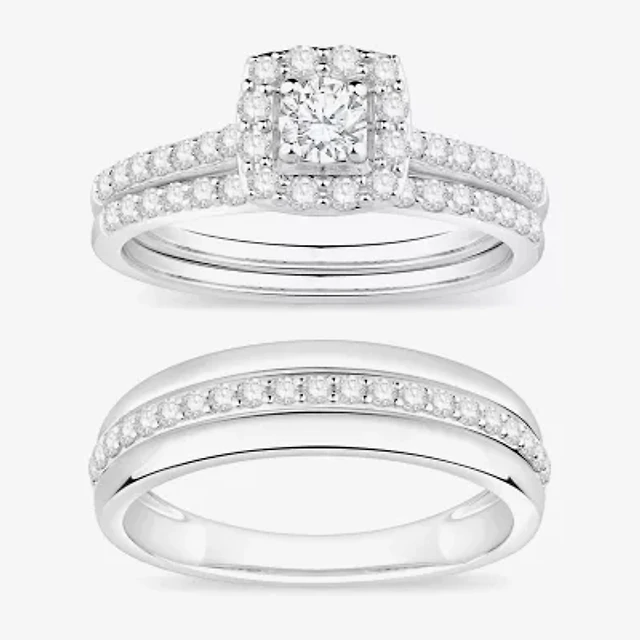 1/2 CT. T.w. Diamond Double Cushion Frame Wedding Ensemble in 10K White Gold - Size 7 and 10