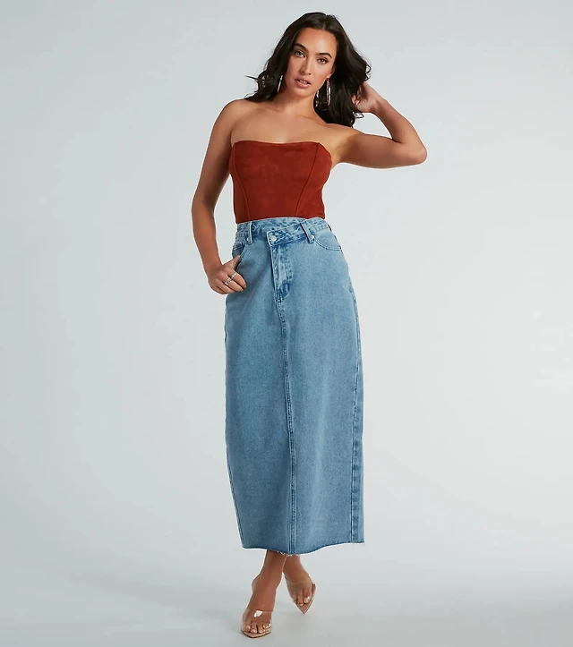 Girl Next Door Asymmetrical Waist Denim Midi Skirt