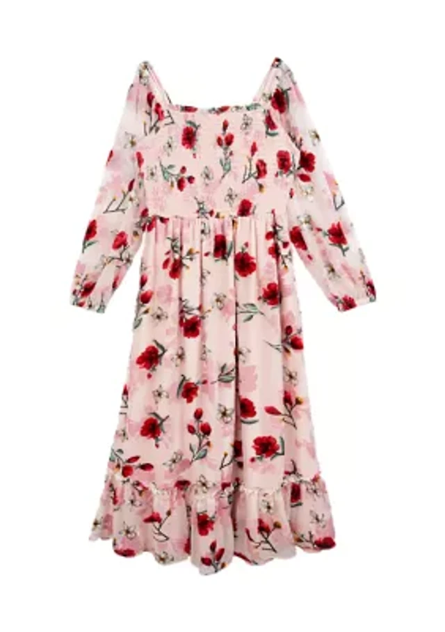 Betsy & Adam Plus Long Sleeve Chiffon V-Neck A-Line Dress