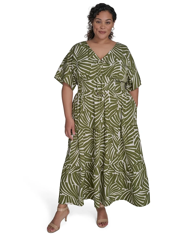 Plus Long Sleeve Keyhole Neck Printed Pleater Dress