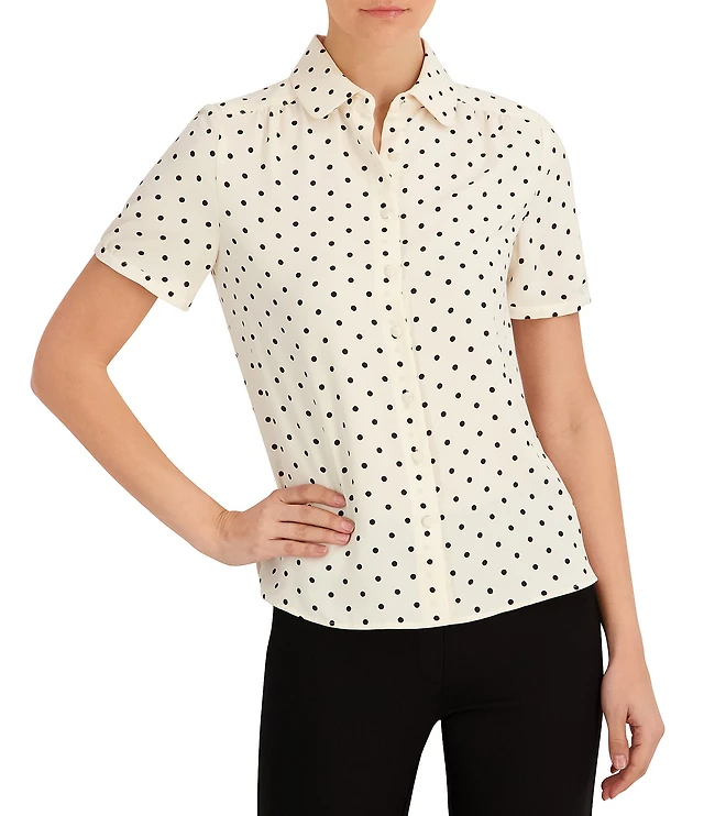 Anne Klein Dot Print Short Sleeve Collared Blouse