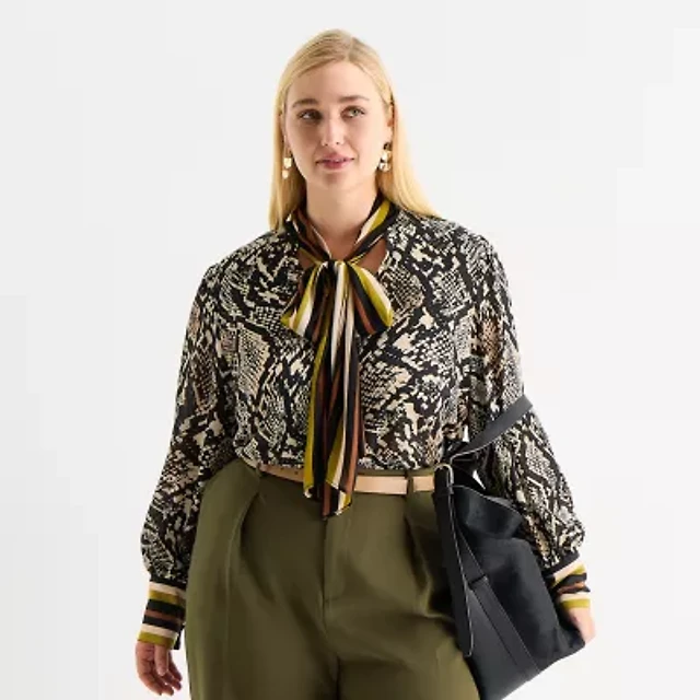 a.n.a Womens Plus Split Tie Neck Long Sleeve Blouse