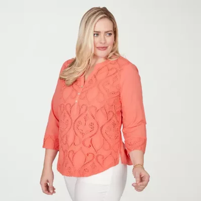 Alfred Dunner Resort Living Womens Split Crew Neck 3/4 Sleeve Lace Lined Blouse