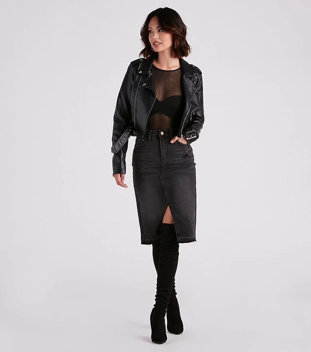 Dark Denim Washed Cut Off Midi Skirt