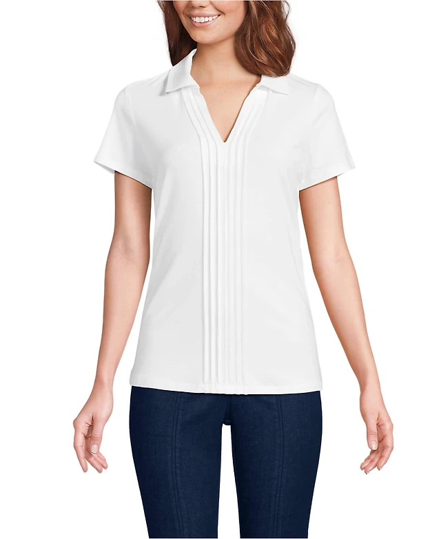 Lands' End Women's Short Sleeve Lightweight Jersey Pintuck Open Collar Polo Top
