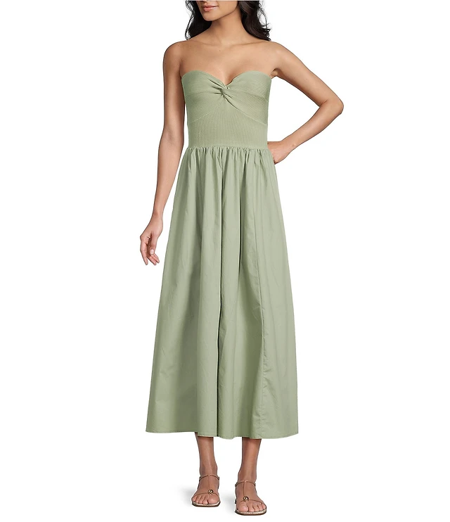 Blu Pepper Knit to Woven Strapless Twist Front Midi Dress