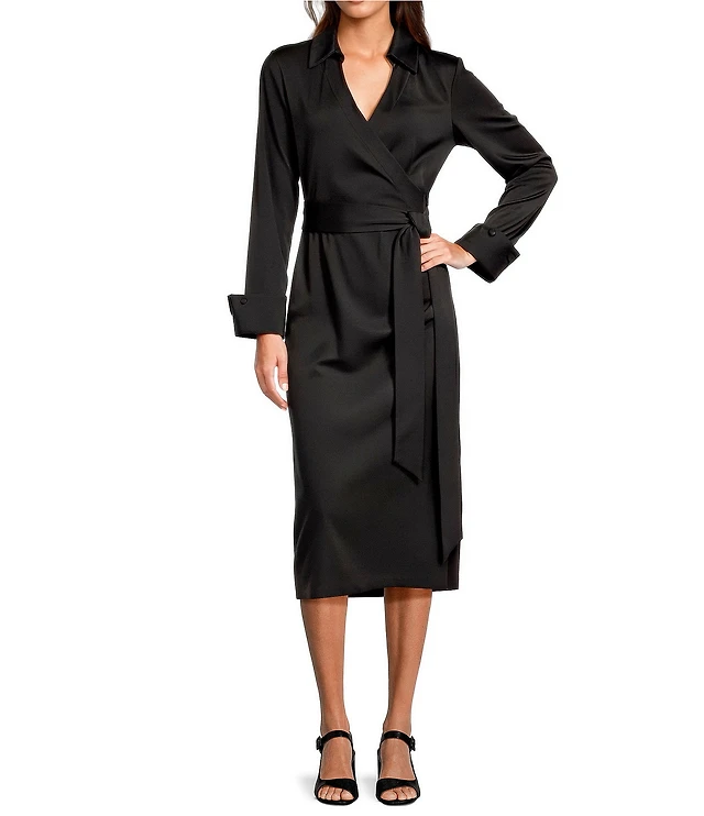 Kensie Metallic Faux Wrap Long Sleeve Crinkle Knit Sheer Overlay Surplice V-Neck Ruffle Hem Midi Dress