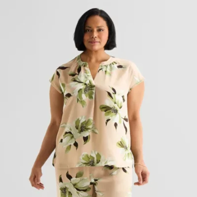 Worthington Womens Petite Round Neck Short Sleeve Blouse