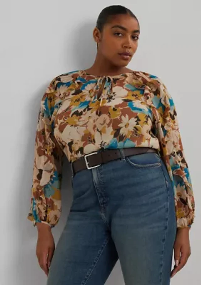 Petite Blouson Sleeve Mesh Mock Neck Printed Blouse