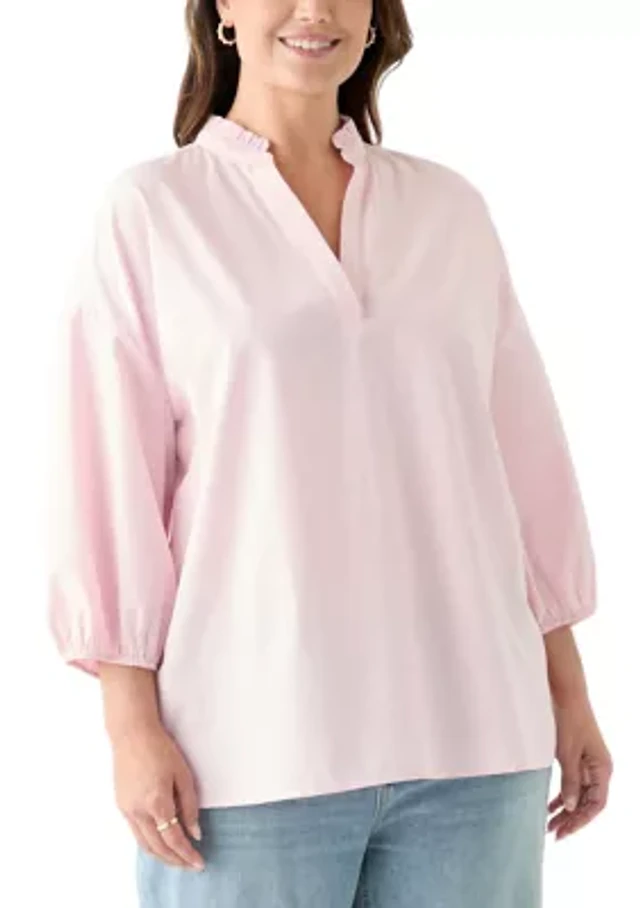 Plus 3/4 Sleeve Ruffle Neck Yarn Dyed Tunic Blouse