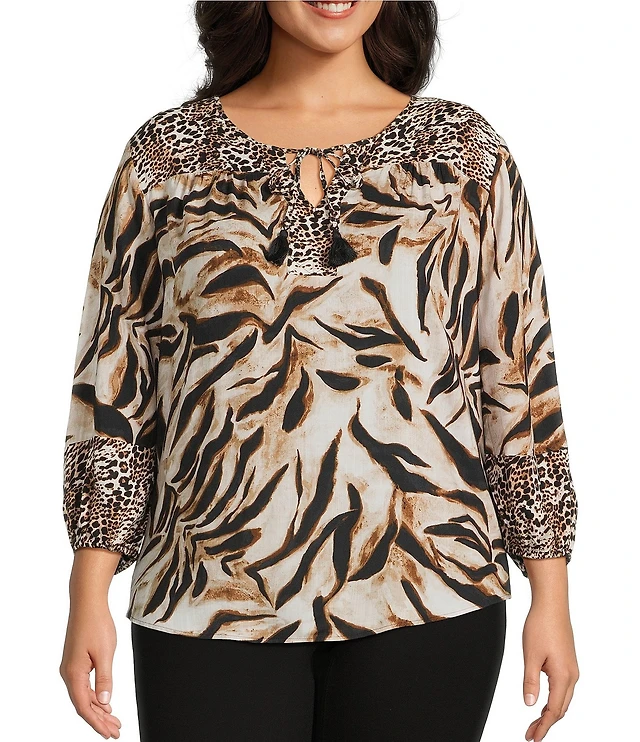 Investments Plus Size Paired Stripe Mixed Print 3/4 Sleeve Split Round Neck Blouse