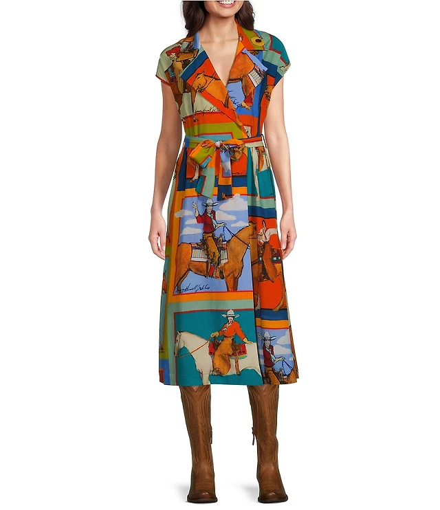 Double D Ranch Women Of The Range Western Printed V-Neck Short Sleeve Wrap Midi Dress