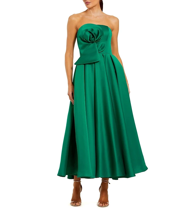 Mac Duggal 3D Flower Strapless Satin A-Line Midi Dress