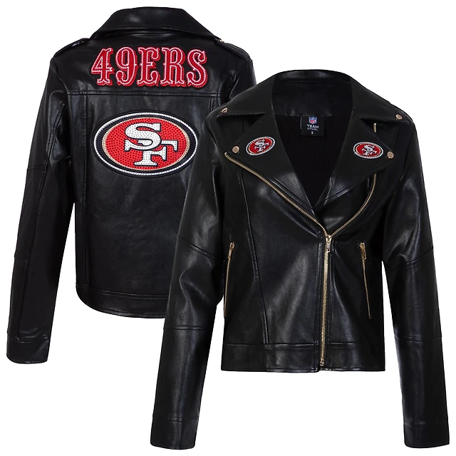 Women's Cuce Black San Francisco 49ers Vegan Leather Full-Zip Moto Jacket with Rhinestones