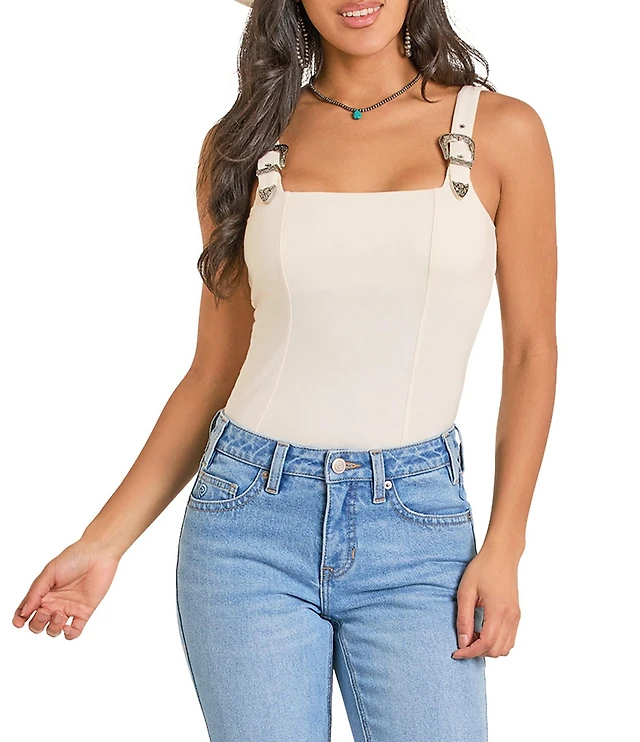 Rock & Roll Denim Square Neck Sleeveless Buckle Strap Tank Top