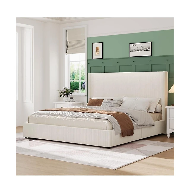 Homfan Upholstered Platform Bed Frame – Corduroy Vertical Channel Tufted Wingback Headboard