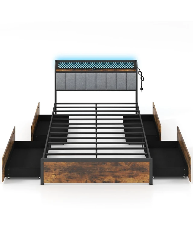 Gymax Led Bed Frame Queen Size W Charging Station Upholstered Headboard 4 Drawers