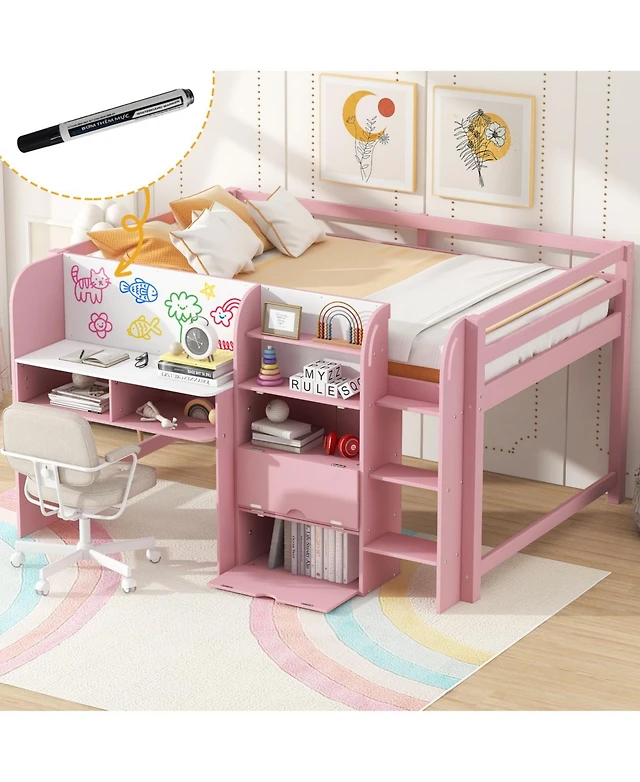 Streamdale Furniture Pink Low Loft Bed with Desk, Storage & Whiteboard