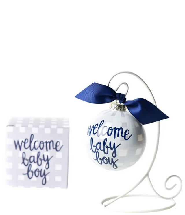 Coton Colors Welcome Baby Boy Gingham Glass Ornament with White Swirl Stand Set