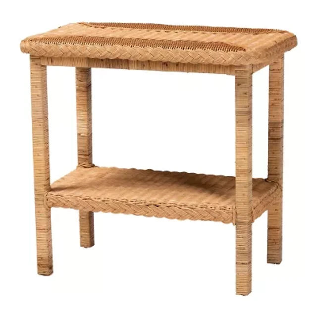 Outdoor Folding Side Table with Woven Accents, Wooden End Table for Living Room, 19 Inch Patio Side Table
