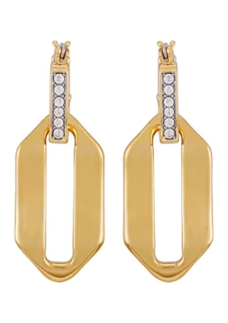 Modern and bold, these Vince Camuto pavé edge hoop earrings feature a geometric silhouette with sparkling pavé accents for a sophisticated statement look. Click top closure Satin finish Imported Material & Care Gold-plated metal Clean with a soft cloth
