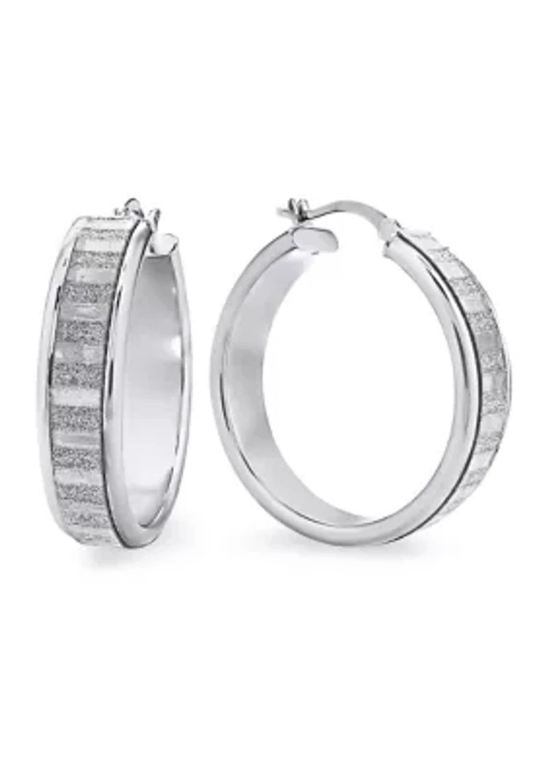 Enjoy these dazzling hoop earrings crafted in sterling silver with rhodium plating. A shimmering silver glitter pattern of stripes is the feature on the outer surface of these high polished hoops have a click-top closure. Click top closure Polished finish Imported Material & Care Sterling silver Clean with a soft cloth