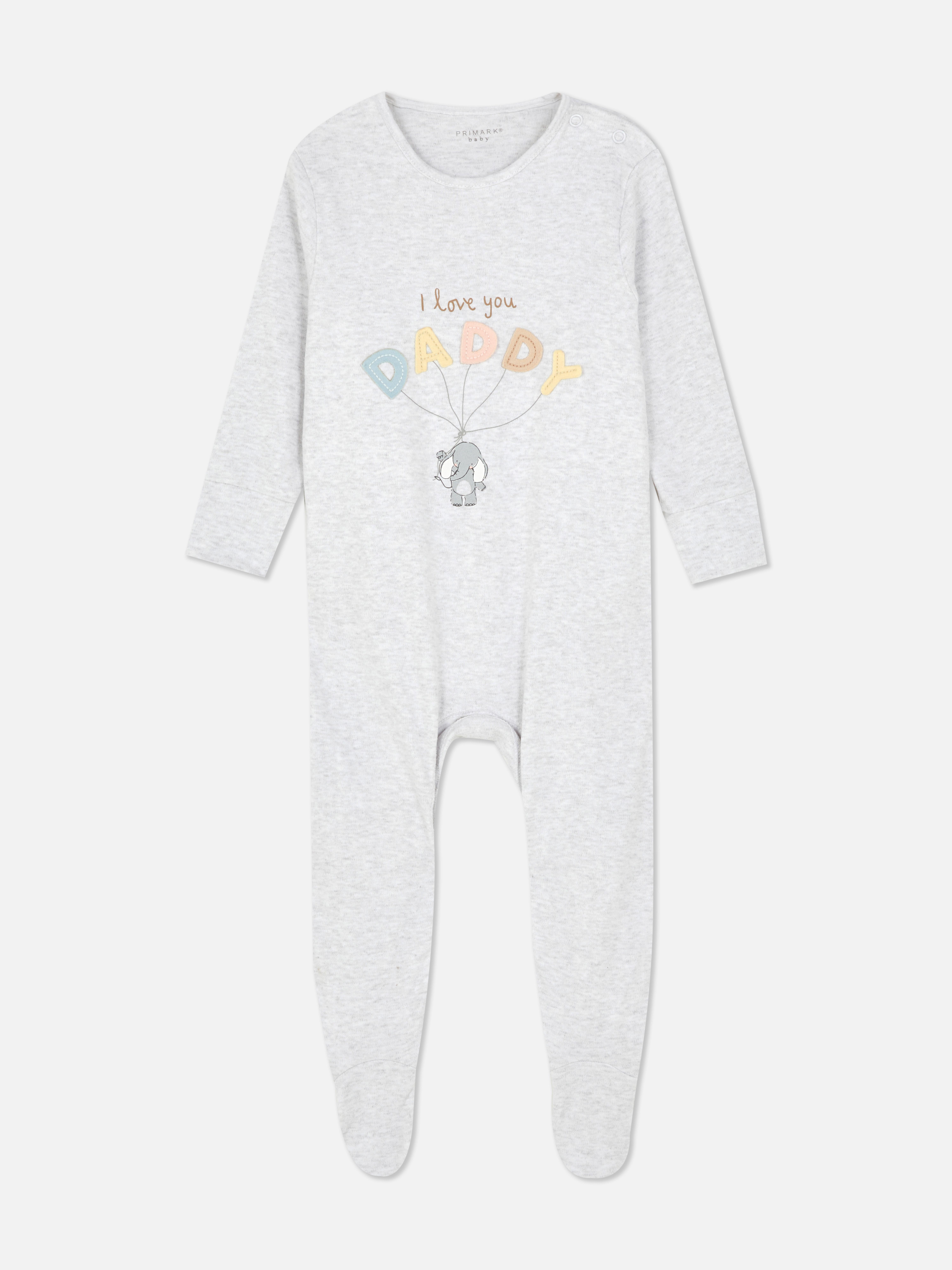Long-sleeve pajamas with snap fastenings, covered feet, and an “I Love You Daddy” lettering design