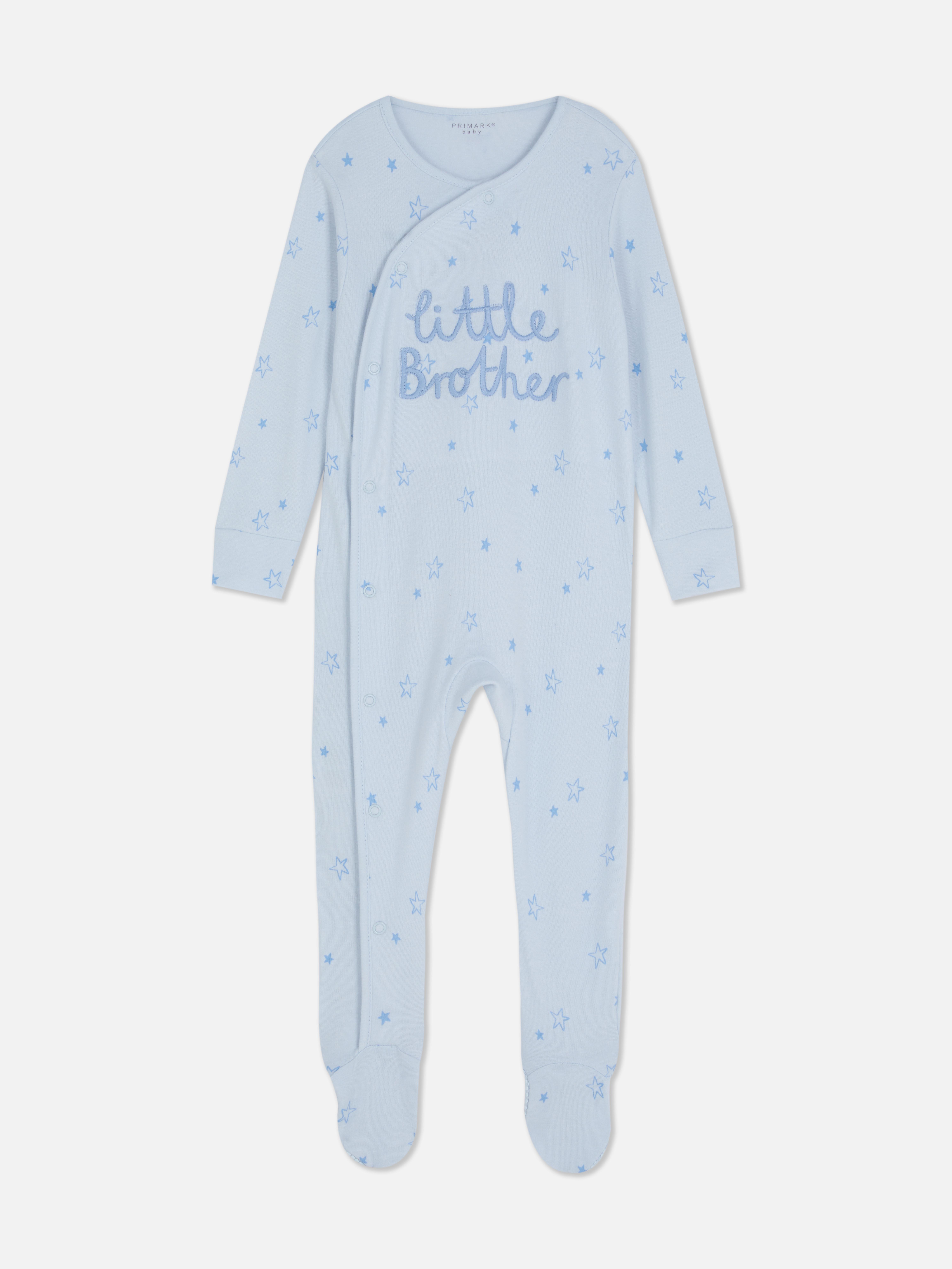 A sibling sleepsuit with a wrap front, snap fastenings and “Little Brother” embroidery