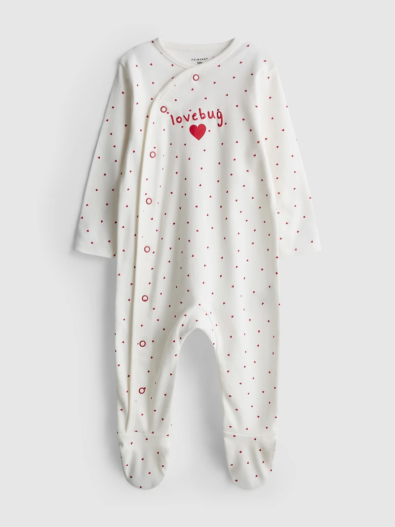 A wrap-front sleepsuit with an allover love heart print