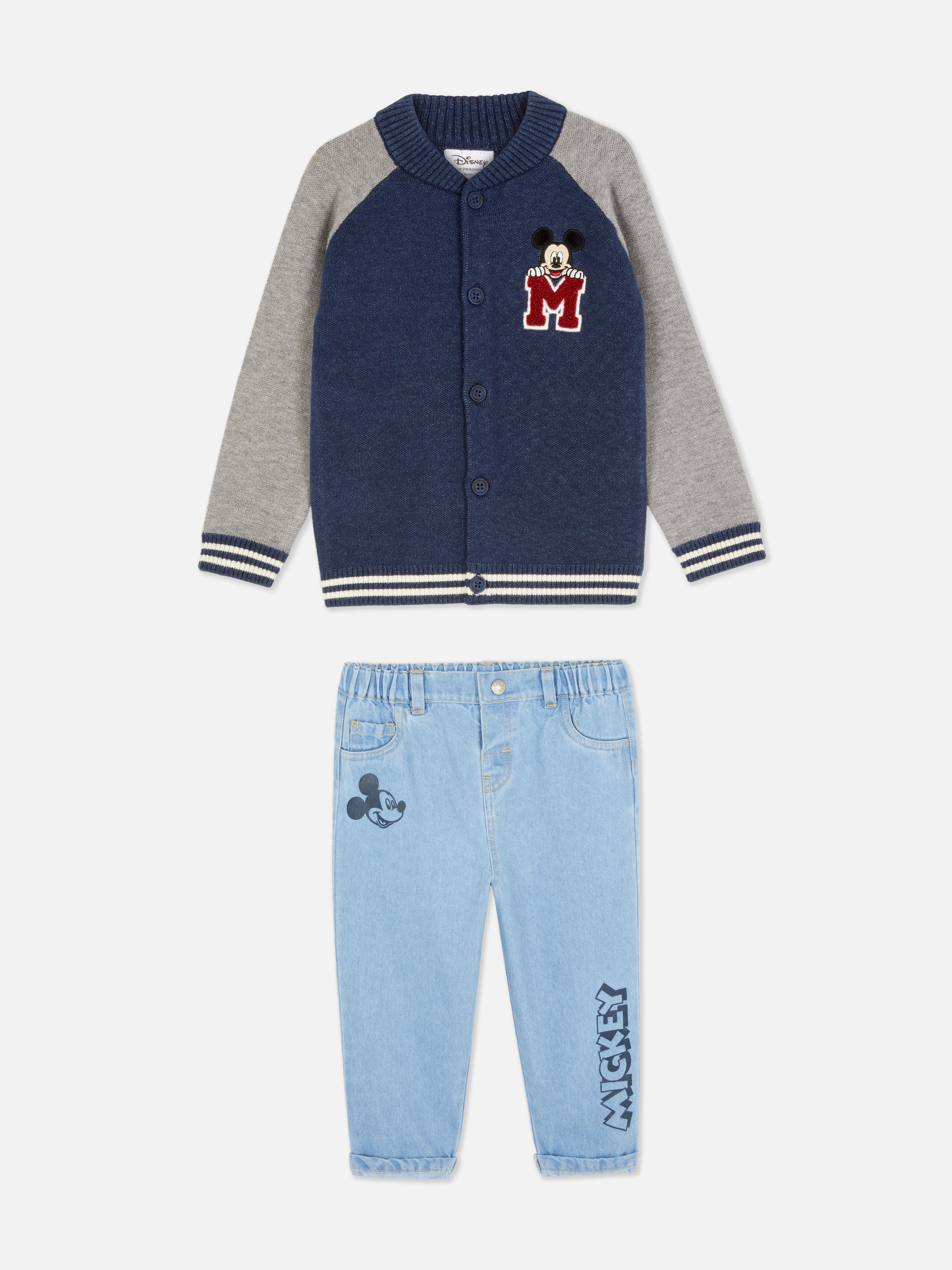 A varsity-inspired Disney’s Mickey Mouse knit jacket and jeans clothing set