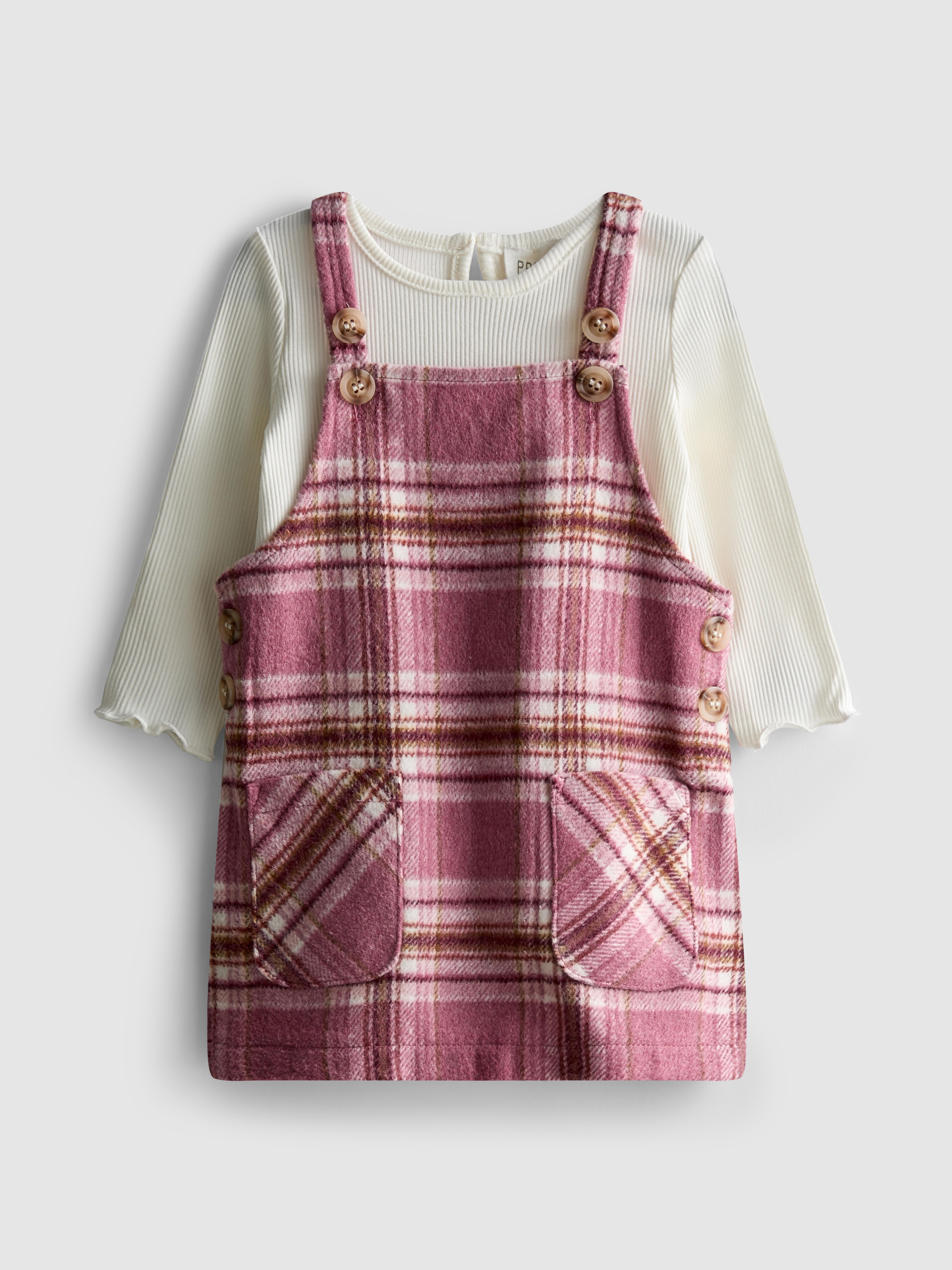 0-36mths | Long Sleeve T-Shirt and Check Overall Dress Set