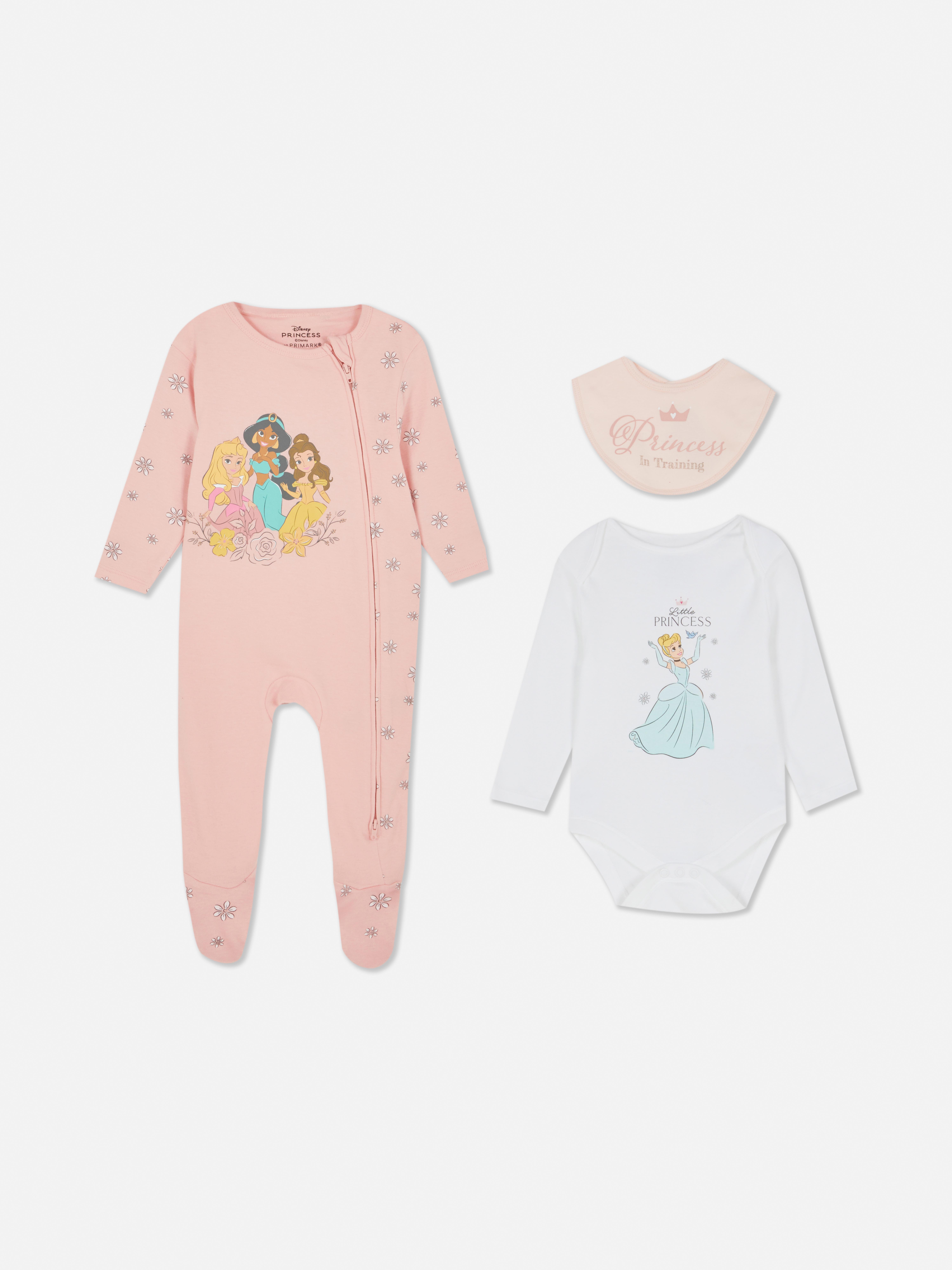 A three-piece newborn baby clothing set, including a Disney Princesses sleeper, long sleeve bodysuit and wrap bib