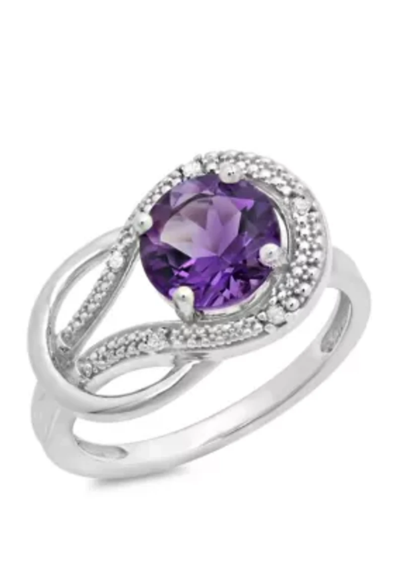 Classic and versatile in design, this gorgeous Amethyst and 1.7 ct. t.w. Diamond love knot ring from Belk & Co. goes perfect with that cocktail dress or with a favorite pair of jeans. They are the definition of a "Statement Ring " and therefore the quintessential addition to fine jewelry collections. Rest assured knowing that all rings and pendants are stamped with "10K" as a symbol of authenticity and a promise of exceptional quality. The gemstone is Heat Treated to enhance color. 1 Amethyst, 5 Diamonds Color rating: H, I Clarity rating: I1- I2 Slip-on Prong setting Polished finish Imported Belk Exclusive Product Specifications 8 mm Width 1.7 ct. t.w. Diamond Material & Care 10K White Gold Requires specialty care