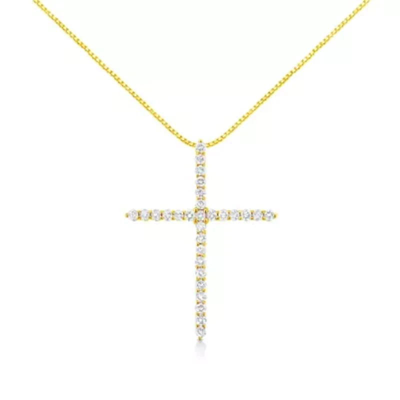 Share your faith with this stunning diamond cross pendant necklace. This cherished cross necklace for her, features 29 natural, round-cut diamonds set in 10k Yellow Gold Plated Sterling Silver. The pendant is suspended from an 18-inch box chain with spring ring. This fine jewelry cross necklace has a total diamond weight of 3.00 carats and is a contemporary classic. Color grade range is J-K and the clarity grade ranges from I2-I3. 29 Color rating: J Clarity rating: I1-I2 Prong setting Warranty available, Limited liability warranty, 60 IN Imported Product Specifications 42 x 3 x 55 3 Material & Care Sterling Silver Metal, Sterling silver Clean with a soft cloth.