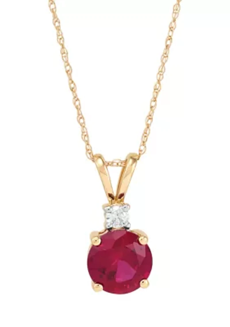 Beautifully accented by 1 Lab-Created Diamond and 1 Lab-Created Ruby, this gorgeous pendant necklace from Belk & Co. is set in 10K Yellow Gold for a sophisticated glow. 1 Lab-Created Diamond and 1 Lab-Created Ruby Spring ring clasp closure Color rating: I Clarity rating: I3 Polished finish Prong setting Imported Belk Exclusive Product Specifications 18.59'' L x 0.27'' W x 0.59'' H 1/10 ct. t.w. Lab-Created Diamond and Lab-Created Ruby Material & Care 10K Yellow Gold Clean with a soft cloth