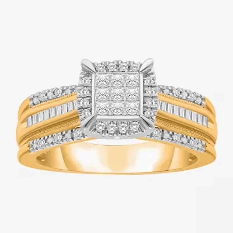 Celebrate your love with this stunning engagement ring in 10K or 14K white or yellow gold. It features 61 genuine white diamonds in multiple shapes, including a princess-cut center stone. The halo design makes this timeless piece a true symbol of your eternal bond.