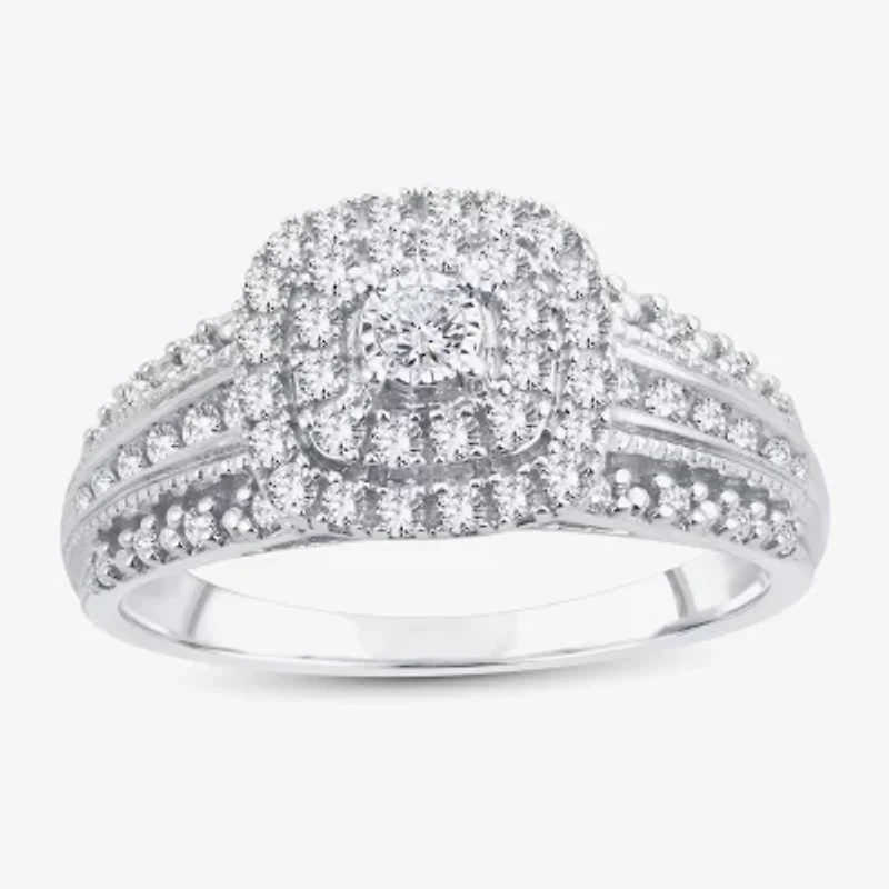 This engagement ring is available in 10K and 14K white gold, features 61 round-cut, genuine white diamonds. This cushion ring flaunts an enchanting halo design that exudes romance and elevates any outfit.