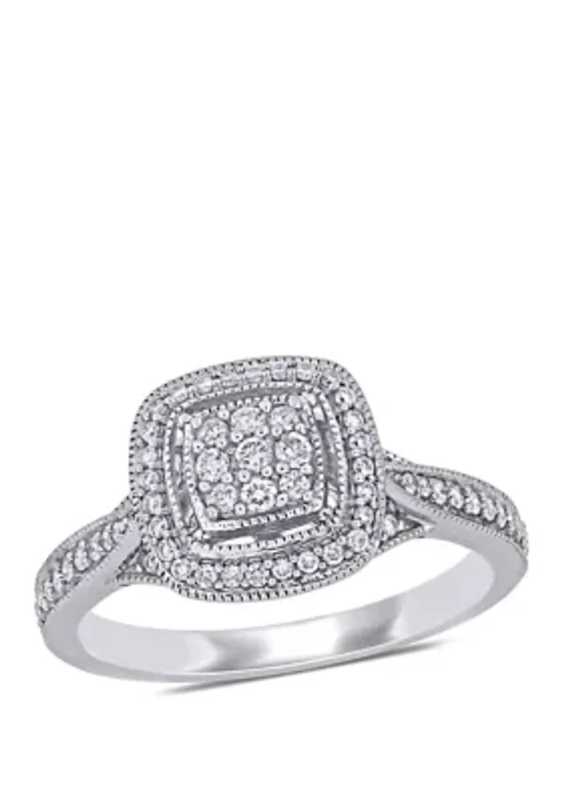 This unique cluster square halo engagement ring from Belk & Co. is crafted in lustrous 10-karat white gold and features 9 round-cut, prong-set 1/3 ct. t.w. diamonds in a clustered square design at the center along with 56 round-cut, pave-set glistening diamonds in a modern square halo design with shimmer along its band. The ring has been crafted to perfection with a high polish and milgrain finish and is sure to make a standout addition to any jewelry collection. Color rating: I Clarity rating: I2 Slip-on Prong setting Polished finish 1-year warranty Imported Belk Exclusive Product Specifications 10.2 mm Width 1/3 ct. t.w. Diamonds Material & Care Metal, 10K white gold Clean with a soft cloth