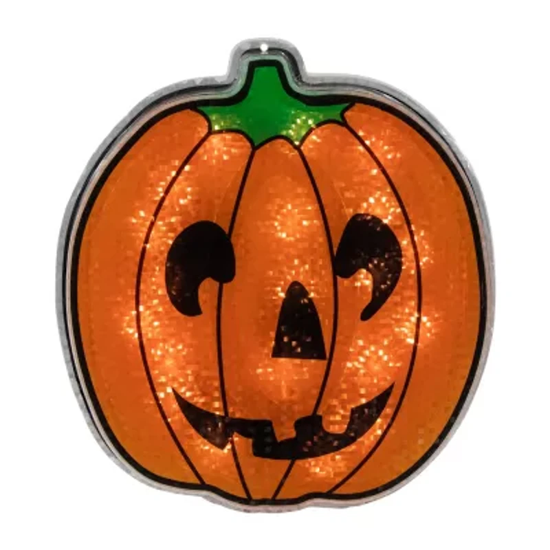 Bring spooky Halloween vibes to your home with this jack o' lantern Halloween window silhouette. This window decoration features a classic jack-o'-lantern design with a bright orange color illuminated by 10 clear mini lights. The silhouette is easy to hang with the included suction cup and is perfect for adding festive charm to your windows during the Halloween season. Whether you're hosting a Halloween party or just looking to get in the spirit this lighted jack-o'-lantern decoration is sure to impress. Product Features: Color: clear bulbs / white wire. Number of bulbs: 20. Bulb size: mini. 24" white lead cord. Double-sided design. Additional Product Features: UL certified and approved for indoor and outdoor use. If one bulb burns out the rest will stay lit. Comes with a replacement bulb and spare fuses. Durable and re-usable. Has 1 plug with end connector which allows you to stack multiple lighted items together (not to exceed 210 watts). Suction cup included. Wire gauge: 22. 120 volts 60 hertz.08 amps 9.6 watts. Dimensions: 13.5"H x 12.5"W x 1"D. Material(s): plastic/wire/glass bulbs.