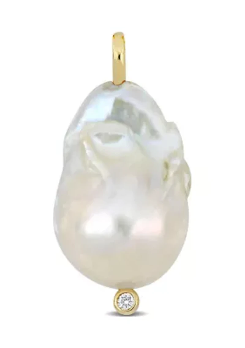 This classy and elegant pendant features a white freshwater pearl in a baroque shape wih a diamond accent on the bottom. Crafted in 14-karat yellow gold. Add delicate simplicity to your casual or evening look with this striking, naturally textured pearl teardrop. 1 Pearl, 1 Diamond 1 pearl, 1 diamond Color rating: H, G Clarity rating: SI Polished finish Bezel setting Warranty available, 60 Days China Imported Belk Exclusive Product Specifications 28.6-mm Height x 14.2-mm Width 0.03 ct. t.w. diamond Material & Care 14K Yellow Gold Metal, Yellow Gold Clean with a soft cloth.