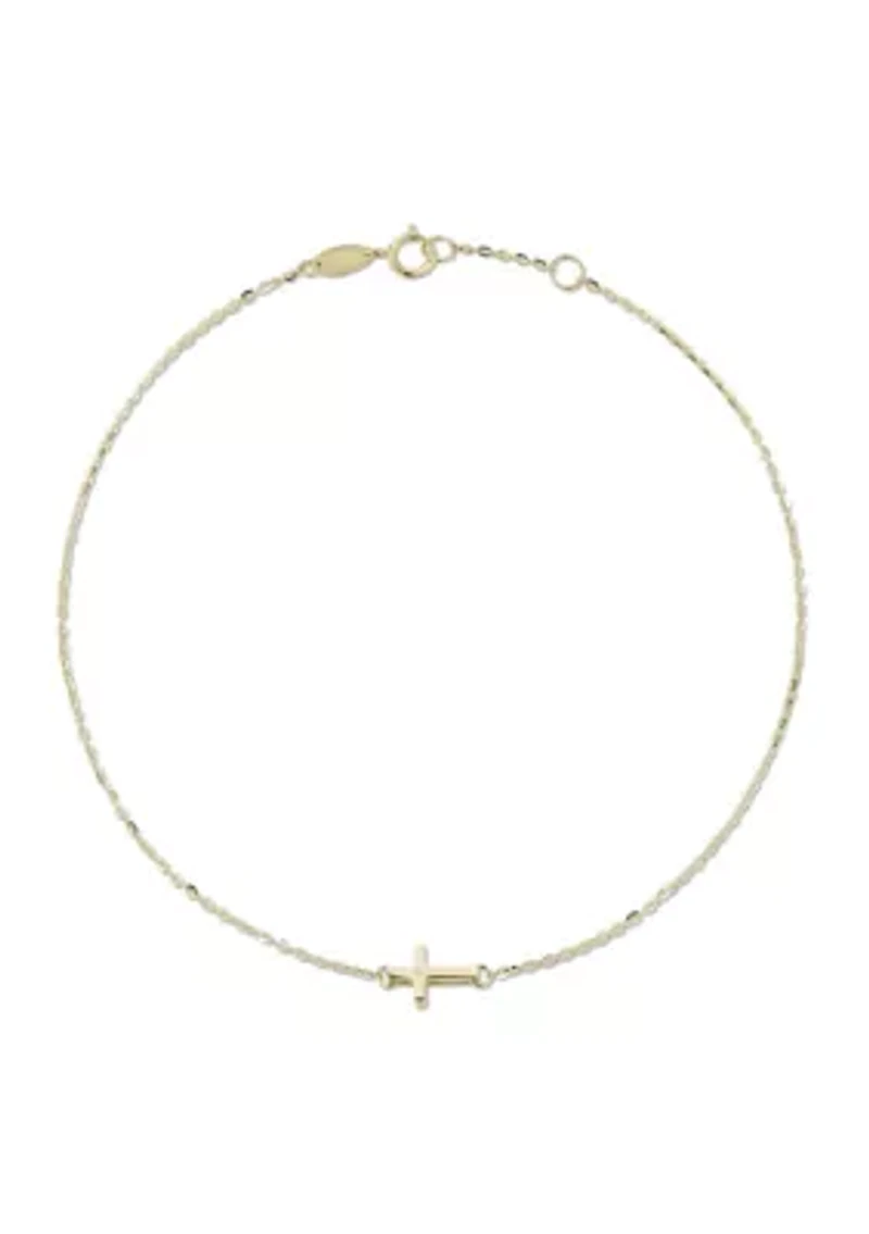 A subtle symbol of faith, the Ember Fine Jewelry 14K Gold Cross Anklet features a polished 14K gold cross suspended on a delicate gold chain. The smooth surfaces catch the light beautifully, creating a refined, elegant shimmer. Minimalist and versatile, this anklet can be worn alone for understated sophistication or layered with other anklets for a stylish, contemporary look. BASE METAL: 14K Gold. ANKLET LENGTH: Approx. 8.5in + 0.5in extension. CLOSURE: Spring ring clasp. 1 anklet Spring ring clasp Polished finish Turkey Imported Product Specifications Approx. 8.5in Anklet length + 0.5in extension Material & Care Gold Use gold polishing cloth on gold items.