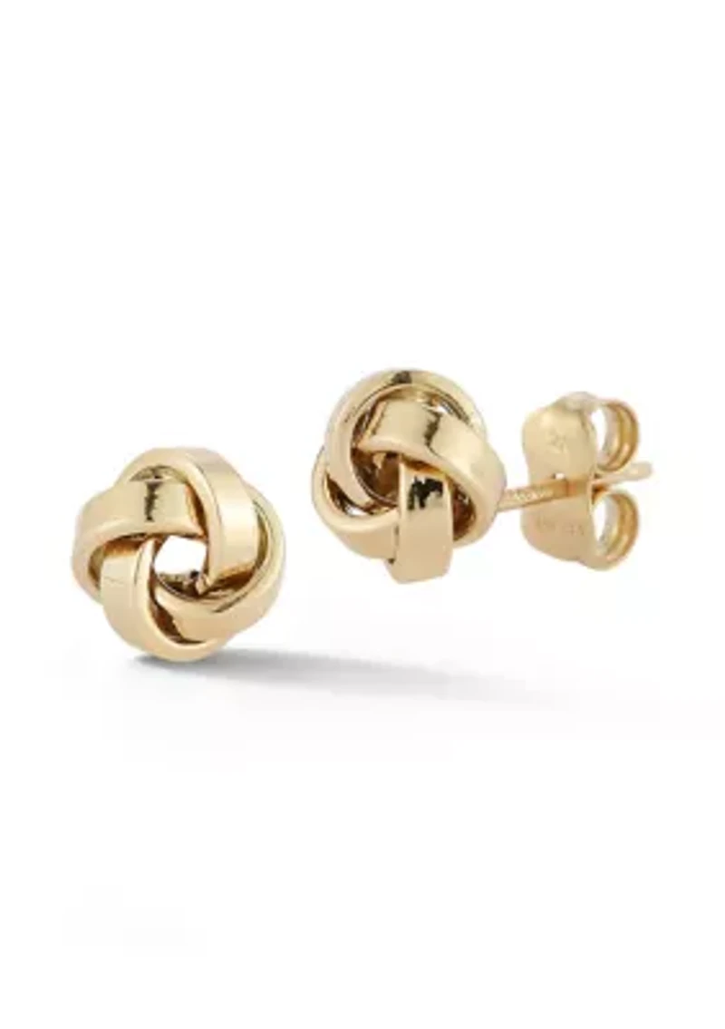 Crafted in polished 14K gold, these dainty love knot stud earrings feature a delicate, intertwined design that symbolizes affection and connection. The smooth, reflective surfaces catch light subtly, adding soft shine and refined dimension. Lightweight and comfortable, they rest securely on the ear with reliable backings for all-day wear. Perfect for adding a subtle, meaningful accent to everyday outfits or layering with other pieces, these studs bring understated elegance, romantic charm, and versatile sophistication to any jewelry collection. THESE EARRINGS ARE SOLD AS A PAIR. BASE METAL: 14K Gold. STUD DIMENSIONS: Approx. 0.3in x 0.3in. CLOSURE: Post back. 1 pair of 2 earrings Post back Polished finish Turkey Imported Product Specifications Approx. 0.3in x 0.3in stud dimensions Material & Care Gold Use gold polishing cloth on gold items.
