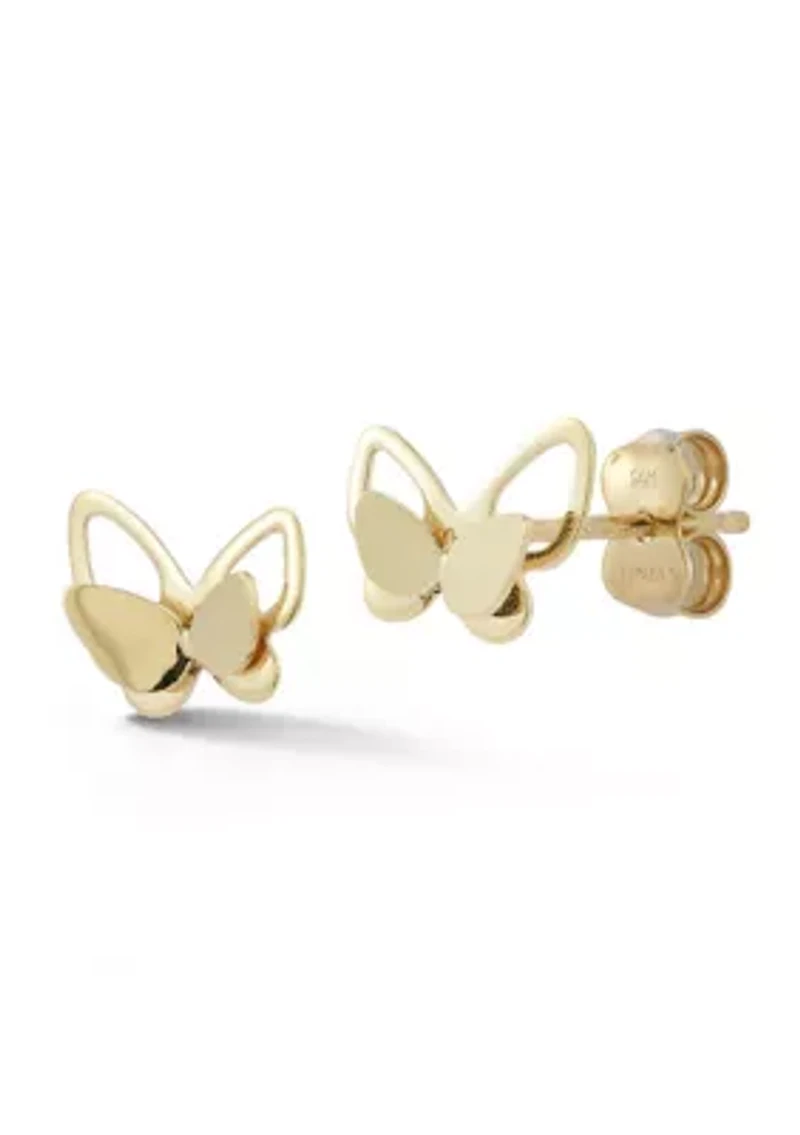 Delicately crafted, these 14K gold double butterfly stud earrings feature two butterflies elegantly stacked atop one another, creating a layered, whimsical silhouette. The polished surfaces catch light subtly, adding dimension and refined shine. Lightweight and comfortable, they rest securely on the ear with reliable backings for all-day wear. Perfect for adding a playful yet sophisticated accent to everyday outfits or layering with other pieces, these studs bring nature-inspired charm, versatile elegance, and timeless beauty to any jewelry collection. THESE EARRINGS ARE SOLD AS A PAIR. BASE METAL: 14K Gold. STUD DIMENSIONS: Approx. 0.35in x 0.3in. CLOSURE: Post back. 1 pair of 2 earrings Post back Polished finish Turkey Imported Product Specifications Approx. 0.35in x 0.3in stud dimensions Material & Care Gold Use gold polishing cloth on gold items.