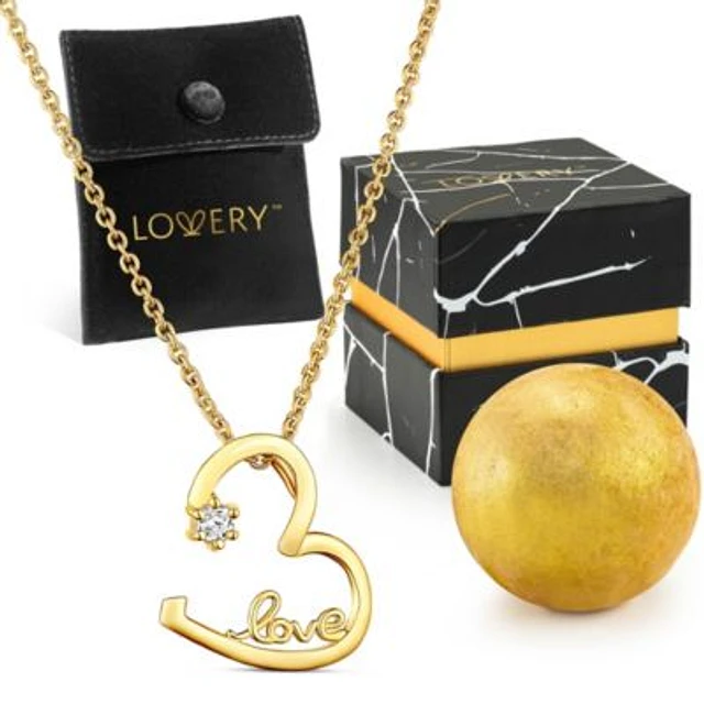 14K Gold Plated Open Heart Cz Stone Pendant Love Necklace with Pouch, Bath Bomb & Gift Box