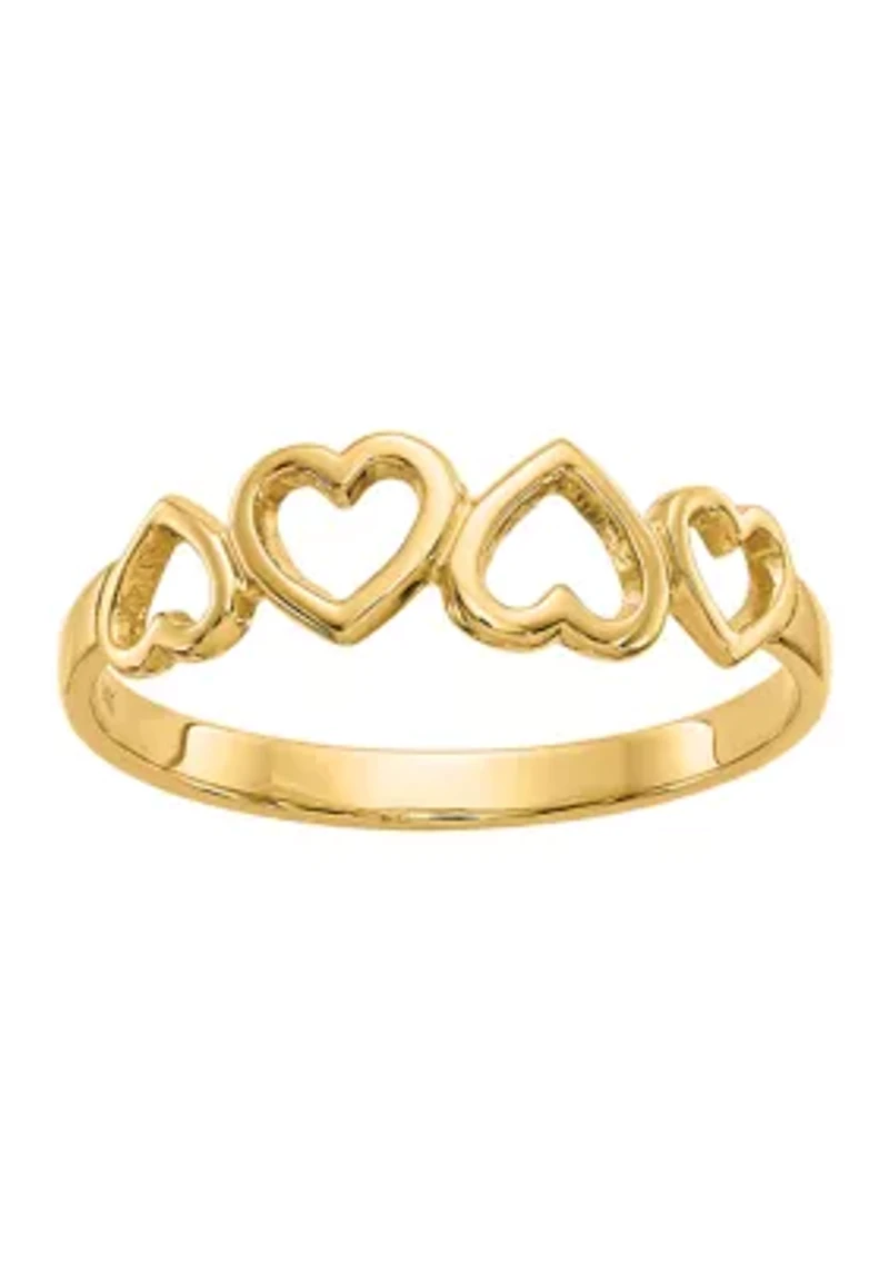 For that special someone, this gorgeous heart ring is sure to impress. Beautifully designed from 14K Yellow Gold, this ring showcases a four cut-out hearts design connected to each other for a charming look. With high polished finish for an elegant shine, this ring comes in finger size 6. Slip-on Polished finish Imported Belk Exclusive Product Specifications 3 mm Width Material & Care 14K Yellow Gold Requires specialty care