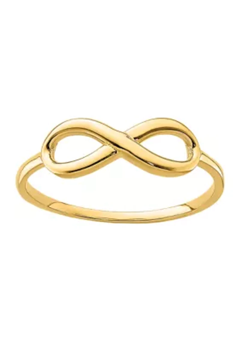 Make the sweetest proposal with this 14K Yellow Gold ring. This solid ring showcases an infinity design that symbolizes your everlasting love and has a brilliant polished finish for enduring shine. This lovely ring comes in finger size 7. Slip-on Polished finish Imported Belk Exclusive Product Specifications 1.11 mm Width Material & Care 14K Yellow Gold Requires specialty care