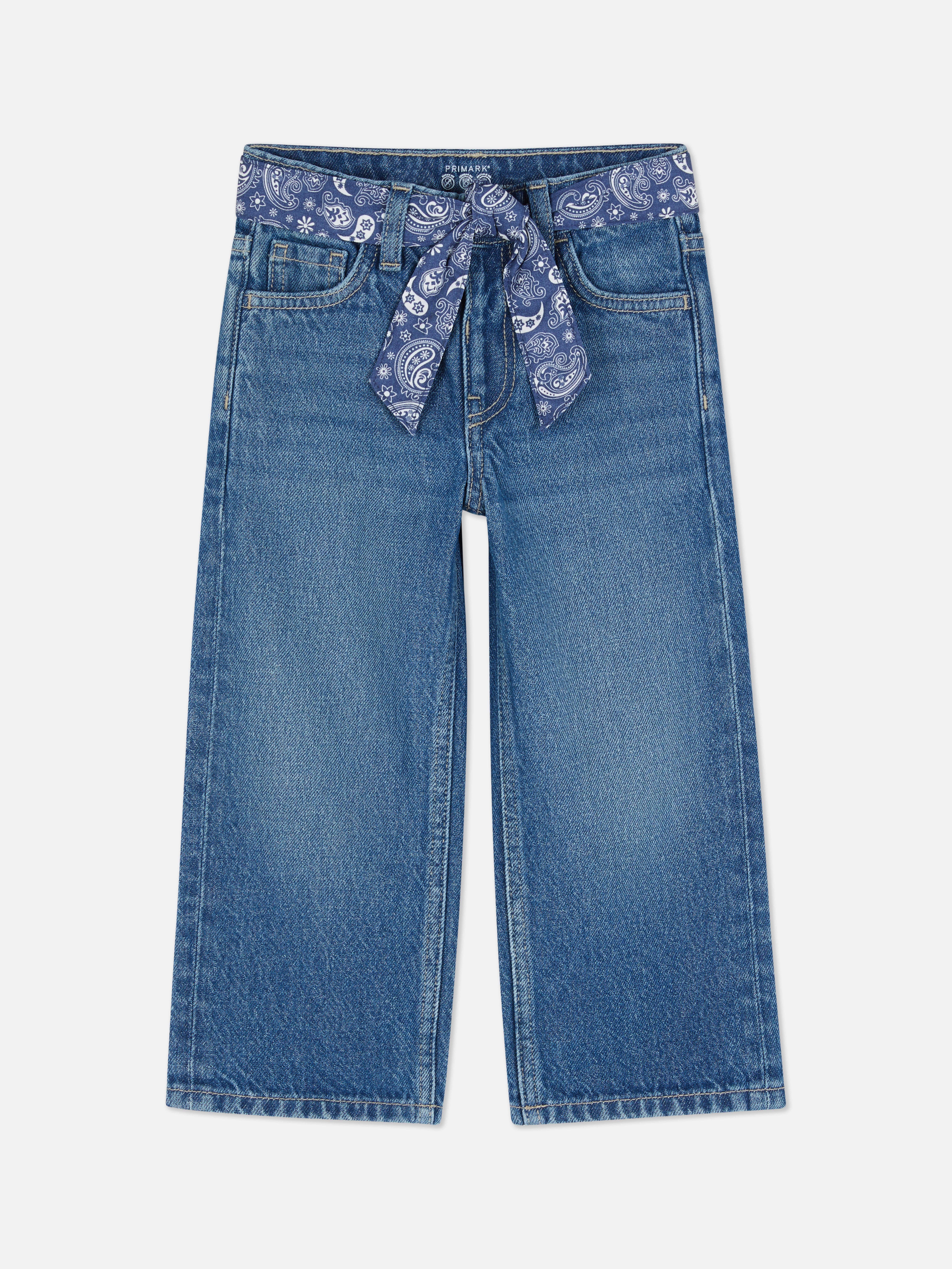 Straight leg jeans with a paisley pattern tie belt
