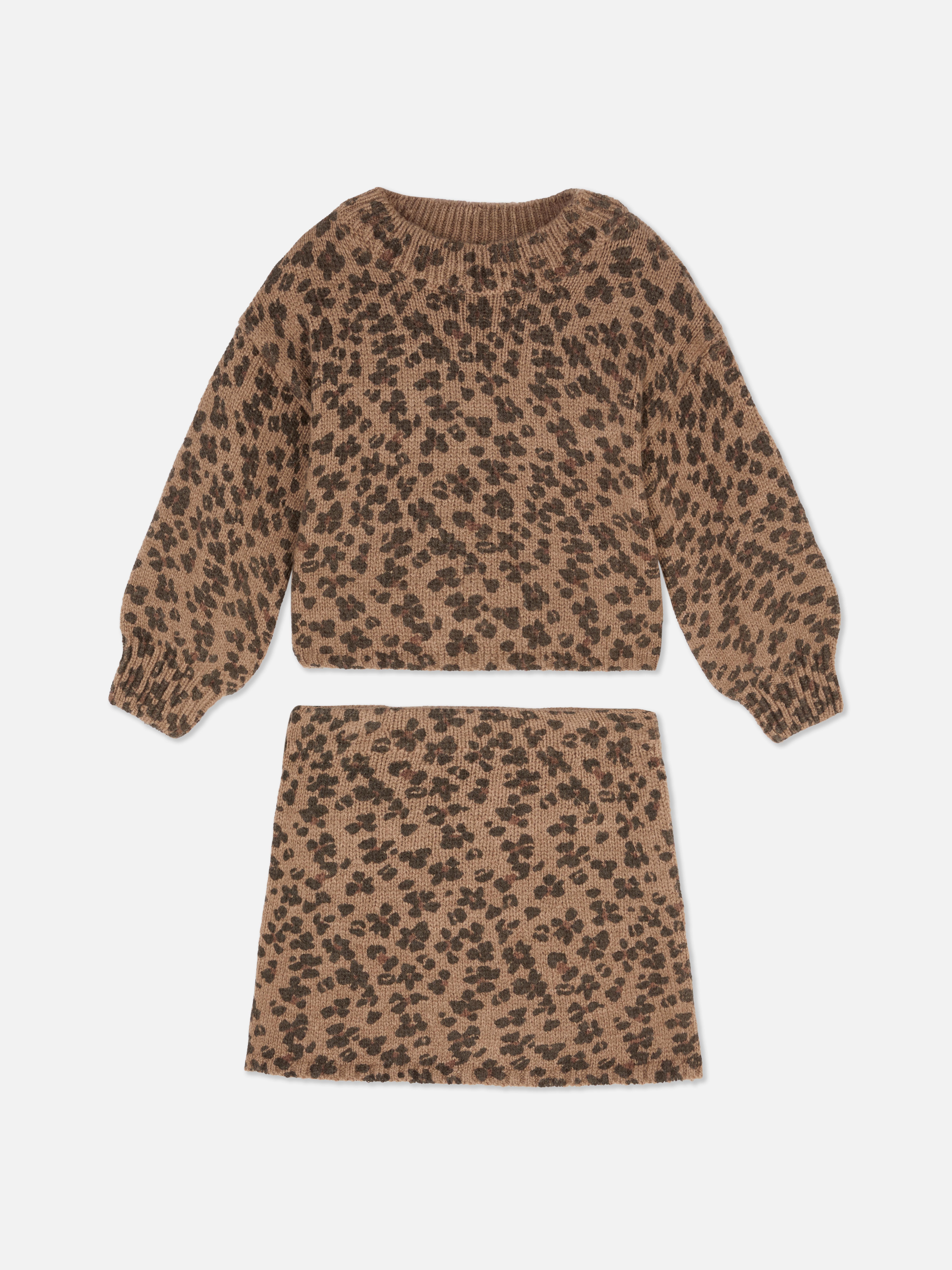 A knit sweater and skirt co-ord, with an all-over leopard spot pattern