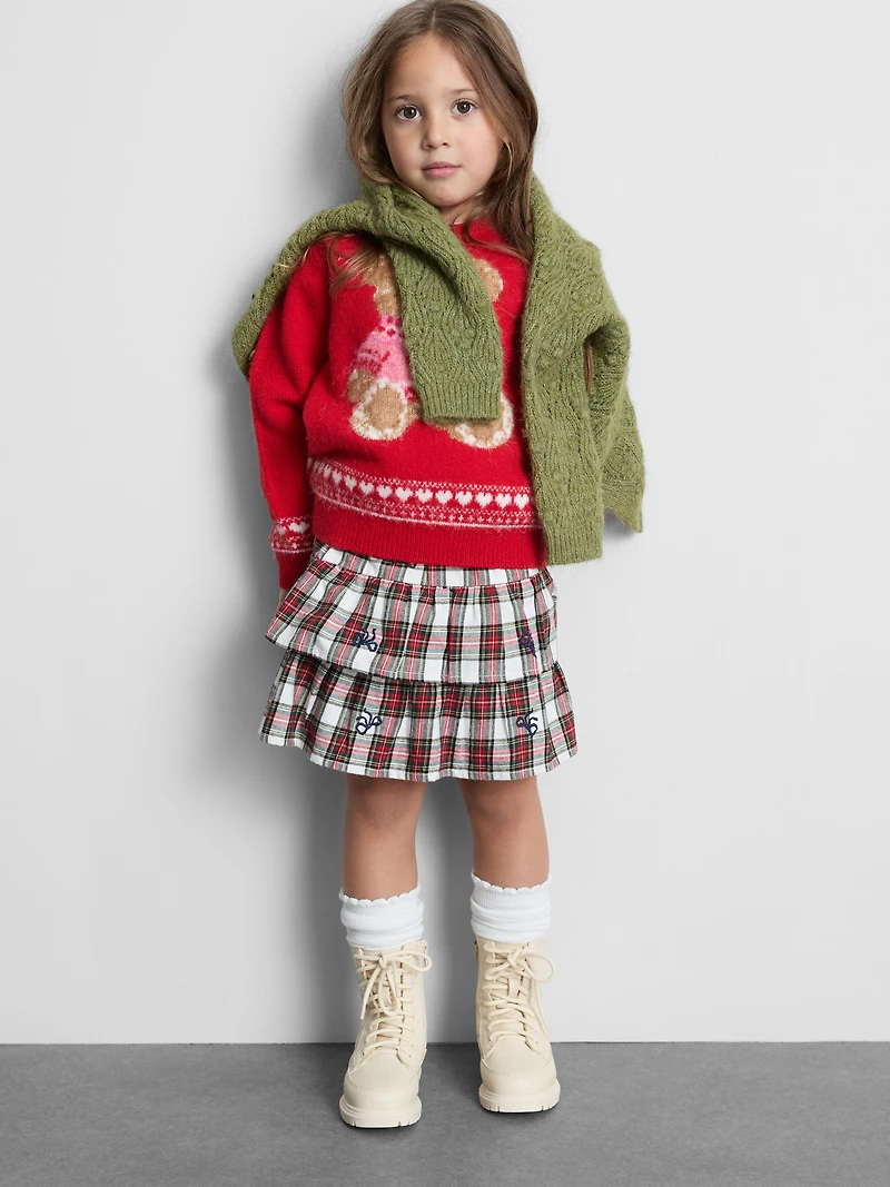 A tiered skirt in a tartan check pattern with bow embroidery
