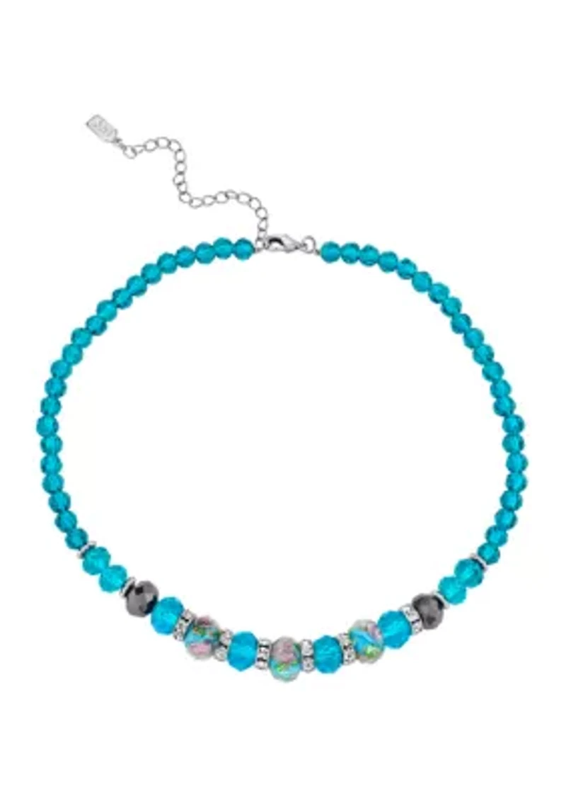 Pretty in Spring! A stunning necklace for the sophisticated woman by 1928 Jewelry. This delicate piece features a row of faceted aqua blue beads combined with clear glass beads with a pink and blue floral design inside, accented with silver-tone crystal bands. Lobster closure Polished finish Imported Product Specifications 16 in x 0.5 in Material & Care Silver-tone metal Wipe clean